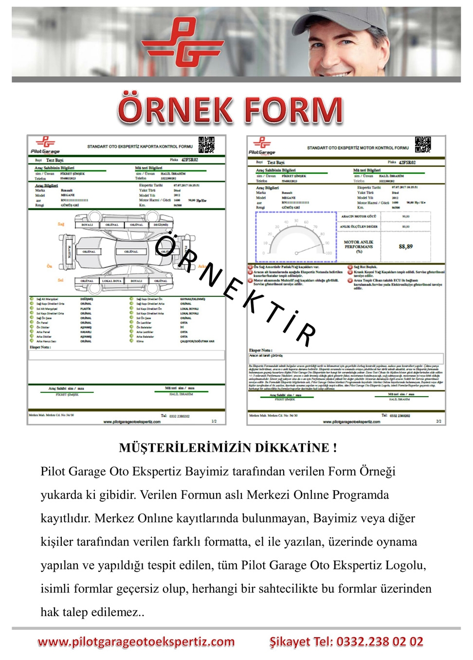 Otomobilinizi güvenerek alım satımını yapabileceğinize dair detaylı Motor performans test sonucunu, Arıza tespit cihaz sonucunu, Boya kaporta test sonucunu, Alt mekanizma tespit sonucunu, fren sistemine ait sonucu, yanal kayma test sonucunu detaylı bir rapor halinde yazılı olarak siz değerli müşterilerimize veriyoruz.
